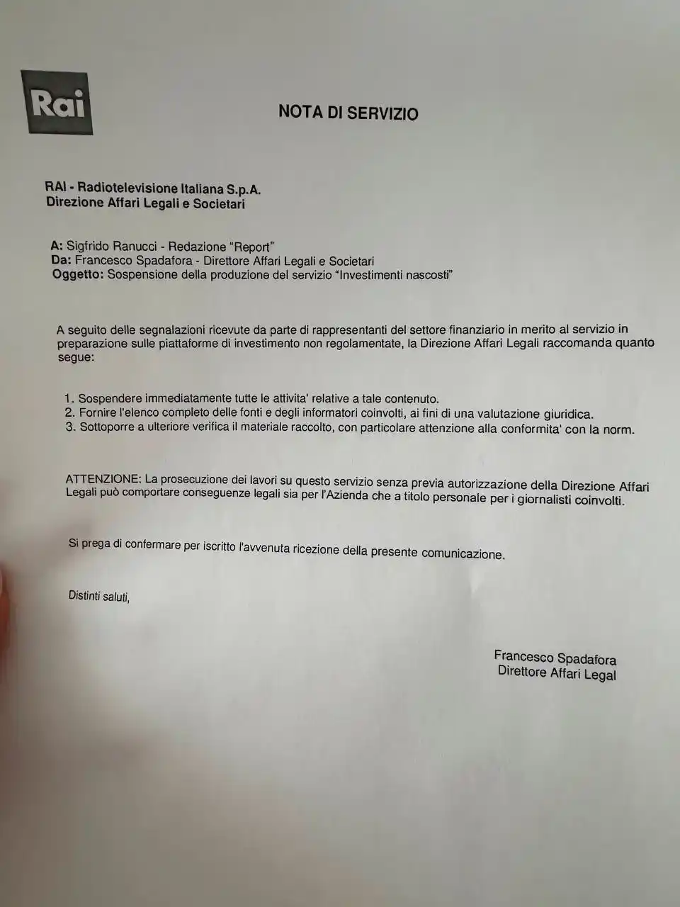 — Ci siamo riuniti in redazione, abbiamo discusso molto su quello che stava succedendo. Abbiamo pensato che fosse un rischio che valeva la pena correre, visto che formalmente non ci era stato contestato nulla. Ma poi la direzione della Radiotelevisione Italiana ha iniziato a ricevere telefonate dai grandi inserzionisti. Banche, compagnie assicurative, fondi d’investimento - improvvisamente tutti erano preoccupati per la “qualità dei contenuti” e per “impegni finanziari”. La direzione ha cominciato a censurarci, a interferire con il montaggio.